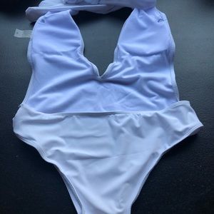 Beautiful white plunging neckline swimsuit with criss cross back.