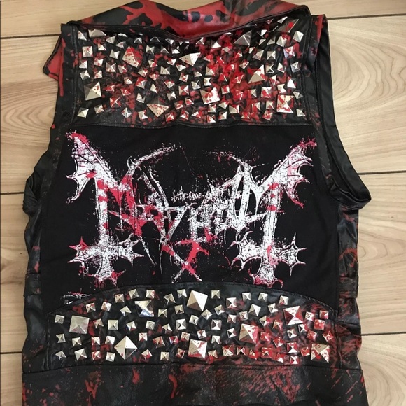 Girls Mayhem vest handmade from scratch with a t shirt and black genuine leather and faux leather. Design on back, metal zip front with fold down collar, blood splatters, studs and hardware all over and raw edged leather bottom hem. Thin & lightweight vest
