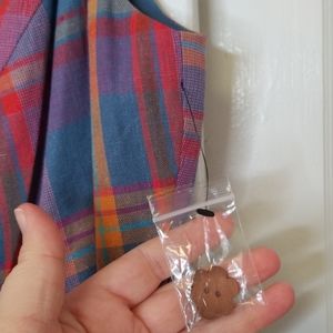 The orange-and pink plaid print of this cotton-linen blended A-line spans the princess-seamed bodice, accent-pleated skirt, and waist-cinching side panels of this playful piece. Plus, its wooden, flower-shaped buttons bring a little extra cheer into an already-upbeat nod to the posh past!
