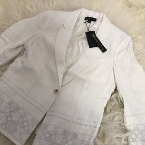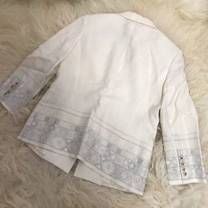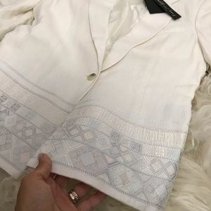 Ivory Elizabeth and James linen blazer with notched lapels, single seam pocket at bust, embroidered hem and button closure at front. Unfortunately, due to restrictions, this item may not be eligible for shipping in all areas.