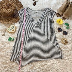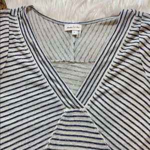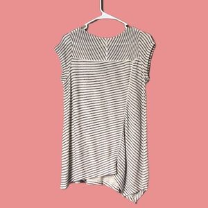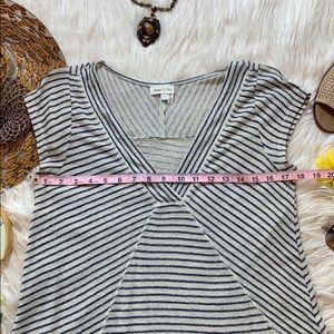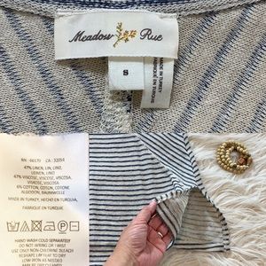 In great used condition Anthropologie asymmetrical striped linen top by Meadow Rue in size Small. Colors are a shade of blue and oatmeal. Has a deep wide v-neckline. Slightly see through. Material is stretchy. Has an open side slit on one side. Please see all photos.