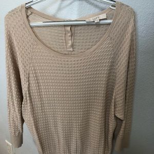 Super cute and comfortable beige sweater with three-quarter sleeves and buttons on the back of neck. Perfect gently condition, very soft! Looks great with blue or black jeans!
