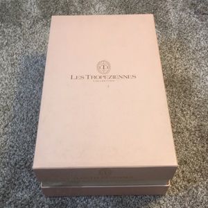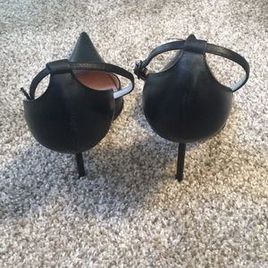 These are in excellent condition and are perfect for the office. Heels are thin and measure 4”. Adjustable ankle straps. They come with a box, NOT the original box however.