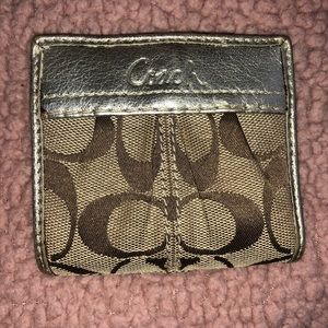 Gold and tan mini Coach wallet. Measures about 3 by 3 when closed. Normal wear and tear as pictured. Perfect first wallet gift for a young girl or travel wallet as it fits in most fanny packs & carry ons!