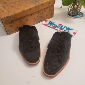 NWT FREE PEOPLE Women's Black Butterfly Faux Fur Flats Mule 6 Sandal Slip On Features - Butterfly pattern, Slip On, Cozy, Faux Fur, Flat, Made in Spain