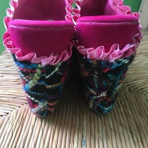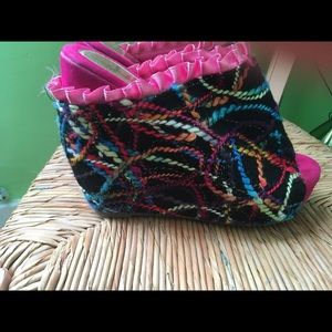 These works of art were worn once with stockings to a special dinner and then hiding in a box in my stuffed closet! The unique threaded fabric with multi colored design and velvet ribbon around the back heel make these not just a shoe but wearable art! The wedge is more comfortable than a heel to dance and walk in. You will be towering above everyone!