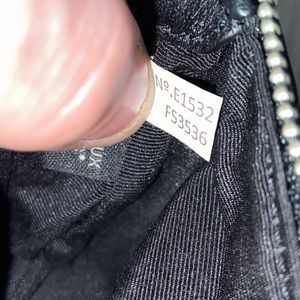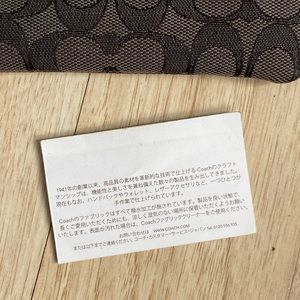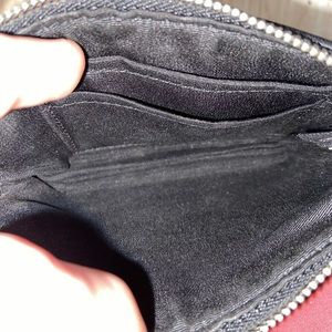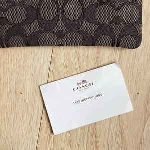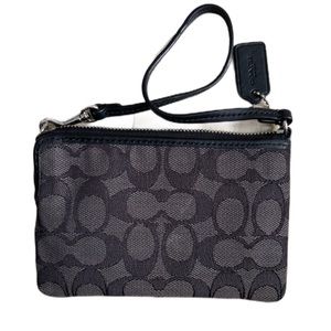 This Coach wristlet comes in black and features the signature double C logo that Coach is recognized for. There are no tags but the care card from the store is still inside. There is no wear on the lining or any spots on the outside. Measures roughly 6” wide by 4” tall.