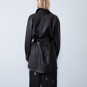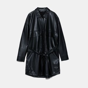 Overshirt with lapel collar and long sleeves. Front patch pockets. Self belt. Side vents at hem. Front closure with lined buttons.