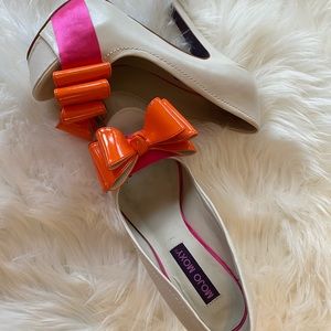 Mojo Moxy white leather pumps. White leather, with orange bow, and a pink ribbon.
