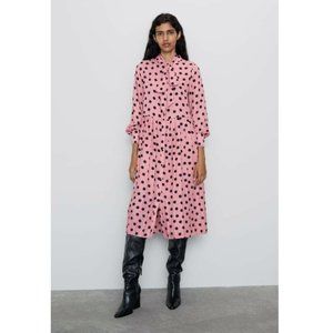 Zara Pleated Polka Dot Long Sleeve Dress w/ Neck Tie Pink/Black NWT.