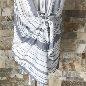 Eco+Carmen blue and white striped partial button down shirt. This shirt is long in the back and has a tie front to give an asymmetrical effect. Super cute with white jeans!