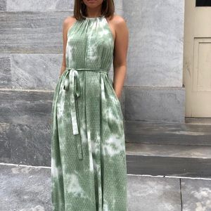 Stylist Pick. Our Zoe Dress features a gorgeous white and green tie dye print, halter neckline, pockets, slip on style, optional tie belt, relaxed flowy maxi silhouette, and a textured fabrication.