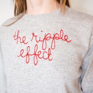 Description: Lingua franca gray cashmere crew-neck sweater with red "the ripple effect" embroidery.