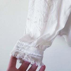 Other: Fringe detail on wriste. Lace detail down arm. Square neckline.