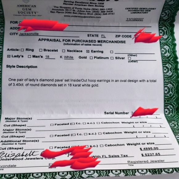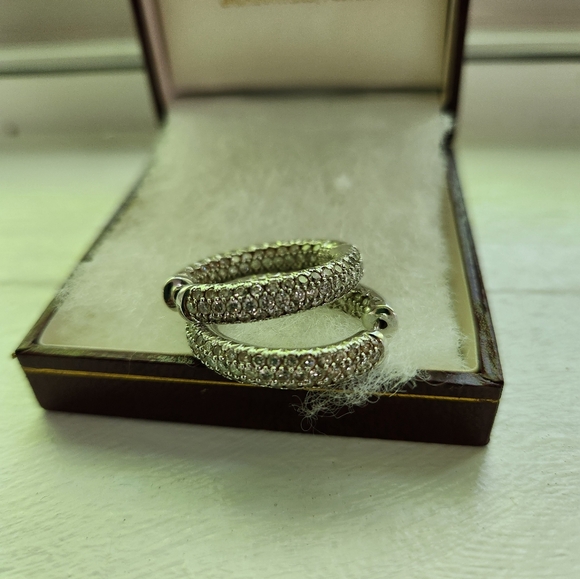 Pair of 3.40ct oval "inside/out" pave set diamond hoop earrings in 18 kt white gold. Comes with certified appraisal of purchase, if you want to add it to your home insurance. These are very real and beautiful. There are diamonds on the inside of the hoops as well as the front. The setting allows the earrings to appear fully covered in diamonds when the wearer is facing forward. Similar smaller pieces with less carat weight are selling for almost $5k. The lighting makes some of the pictures look like it has a brownish hue to it. However, the earrings sparkle and are beautiful. Can be worn daily or for special occasions. Definitely has that bling factor. They are similar to the diamond hoop earrings worn by the cast members in The Real Housewives franchise including NYC, Beverly Hills, and Atlanta. Perfect for a holiday gift for someone special or gift to yourself!! When shipped will require signature.