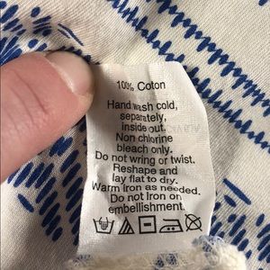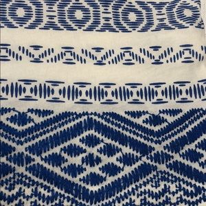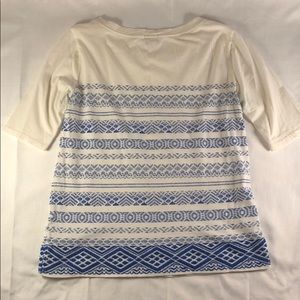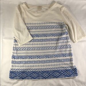 J. Crew Embroidered Printed Stripe top style A0284. Size XS .Cream & blue. Elbow sleeves. All over printed design with thick embroidered hem of same color. 100% cotton. Slight armpit discoloration at photographed.