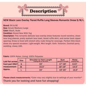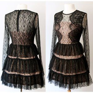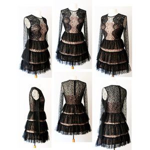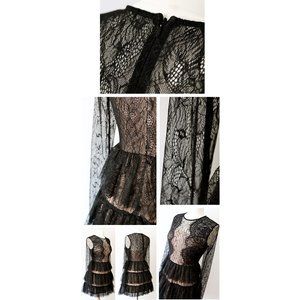This romantic delicate lace overlay dress features round neckline, sheer lace long sleeves, pretty eyelash lace inset, tiered ruffle skirt, and center back zipper opening. Dress is lined with stretch silky nude lining for coverage. Perfect little black dress any special occasion. Light-weight. Mini length.