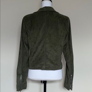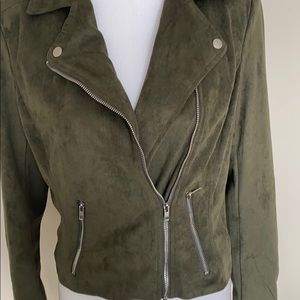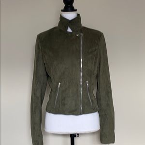 Faux suede, very soft. Has zippers on sleeves and two front zipper pockets. Mint condition.