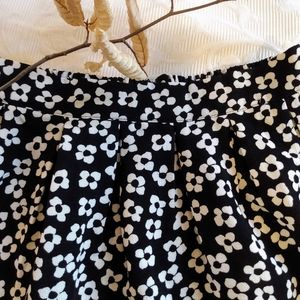 black and white floral print skater skirt with elastic waist zip back and subtle pleating at front of waist