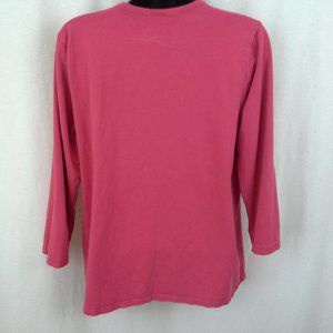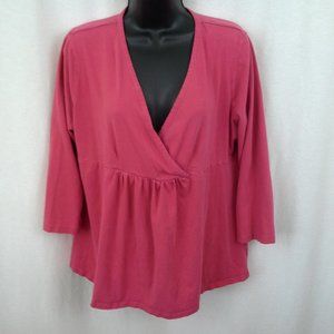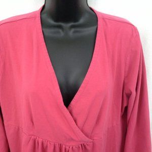 Motherhood women's top t-shirt. Host pick (HP). Size L. Maternity. Pink. Surplice empire gathered. Long sleeves. Wash wear. Light fading near back neck, see photo near penny. 96% cotton, 4% Spandex. Location 2826-eS. Non-smoking cat-friendly home.