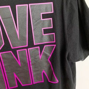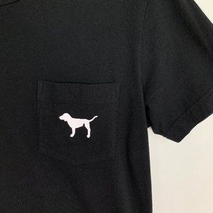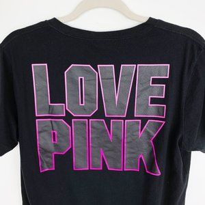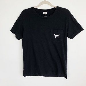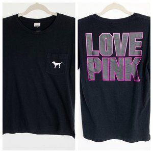 PINK Victoria's Secret Black "Love Pink" T-shirt. Black Short Sleeve Tee with white dog logo on patch pocket in the front. The back says LOVE PINK with hombre pink outlining.
