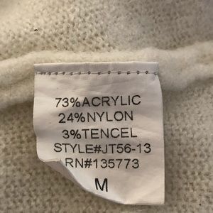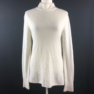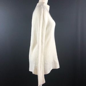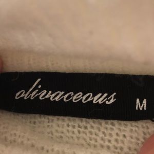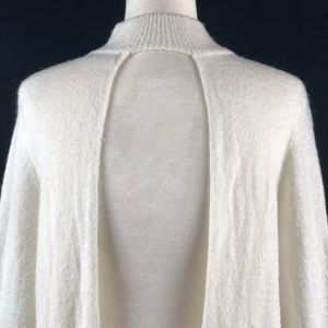 Olivaceous Ivory Fuzzy Open Back Sweater. Ivory color. Round neckline. Long sleeves. Open back. Super soft, fuzzy, stretchy sweater material. Size medium. EUC, excellent used condition. No flaws. Measurements taken laid flat. 15.5“ shoulder width, 18“ bust, 26.5“ length.