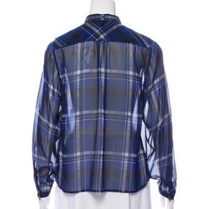Blue Rag & Bone silk top featuring plaid print throughout, and button closures at center front.