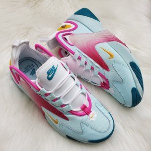 New In Box, No Box Lid, 100% Authentic, Firm Price! Retro meets futuristic in the Nike Zoom 2K. Rubber wings wrap up and around the outsole, while an exaggerated heel design is reminiscent of the early 2000s. A mesh vamp provides breathability and ventilation, and the Zoom Air unit cushions every step. Upper is comprised of a variety of materials and textures for a modern design. Textile tongue and webbed lacing system offer a secure fit. Color: Teal Tint/ University Gold