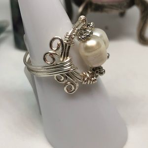 Silver wire wrapped ring highlighted with two freshwater pearls.