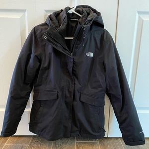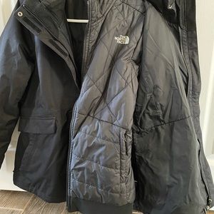 Good condition!! Women’s black North Face Coat! Has an extra jacket inside that can be unzipped and worn separately. Size: medium! Small mark on left side on pocket (pictured here). No trades please! Accepting reasonable offers!