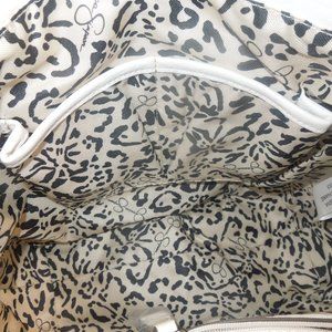 Magnetic snap closure. Material: faux leather. One back zipped pocket, with Jessica Simpson name logo.