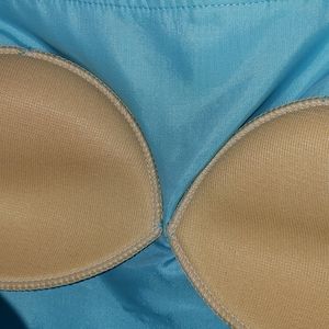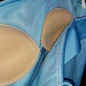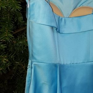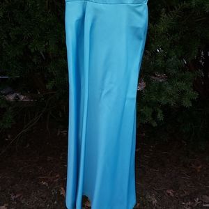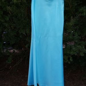 Stylish spaghetti strap Formal Blue gown. Side zipper. Length 54". Built in padded bra. Bust 28". Waist 24". Minor wear. In excellent condition