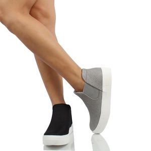 Black Round Toe Canvas Elastic Slip On Loafer Shoes, very comfortable shoe. Model is a size 7, and a size 7 fits her perfectly. This listing is for black, grey is a different listing.