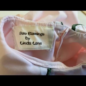 A beautiful handmade girls dress. This one of a kind dress fabric it features a waist of lovely smocking accented with pink and green embroidery. The collar also features accenting green piping and the sleeves have a lace edging.This dress is great for Easter or photographs or just a little girl who enjoys dresses and looking feminine. Sized 5-6 but please see photos for exact measurements especially as this a handmade dress.
