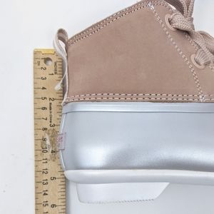 - rose pink Nubuck leather upper with silver metallic gray grey bottom