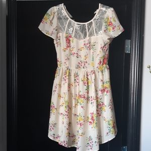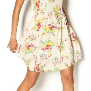 Cream floral dress with a sweetheart neckline, sheer lace inserts and a hidden zip closure. Pair this with a floppy summer hat and some wedges or sandals for a classic look.