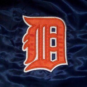 DETROIT TIGERS MLB 3X STARTER JACKET. High quality polyester Satin Jacket with a snap up front and ribbed knitted cuffs, collar and waist band. The jacket has a polyester outer shell and the inside lining is soft polyester. The "DETROIT TIGERS" Lettering & Logo is meticulously sewn on. Color: BLUE with WHITE & ORANGE Trim & Lettering Measurements: 3X: 31" across the chest armpit to armpit (STARTER makes sizing on the bigger side)