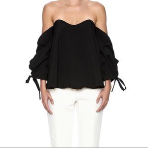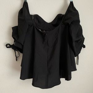 Size L NWT DO + BE strapless sweetheart off shoulder top. Has poofy tie sleeves, ribbing structure in top & a zipper in back.