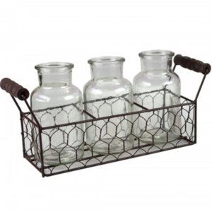 The Three-Piece Medium Glass Bottle SET with Chicken Wire Basket is approximately 11" x 2.50" x 3" x 4.50”