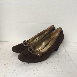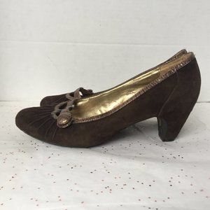 Adorable Yves pump in rich chocolate suede with cute button detail at vamp. Amazing rubber sole and so comfortable. Excellent, lightly used condition. The suede has a ruched, almost pleated detailing and the heel is covered in suede as well. There in an embossed reptile trim all along the shoe with cute decorative button. Gives it a vintage vibe.