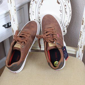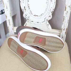These are absolutely awesome! They are a two toned brown "leather" shoe with bronze fittings. The cushion sole is removable. Perfect condition.