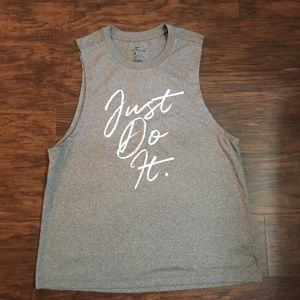 Nike Women’s Just Do it Tank. Gray is the color. Ribbed Collar. Size M. Good Preowned Condition. Stretch Cotton Fabric.
