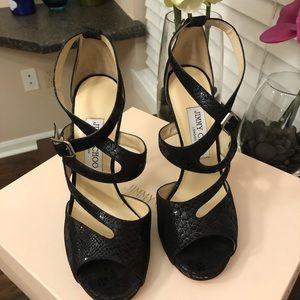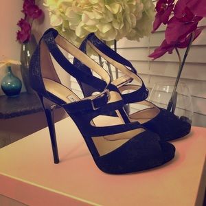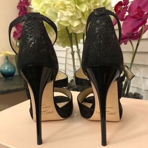 Black suede, python embossed sandal, NIB with dust bag. 4.5 inch stiletto heel.