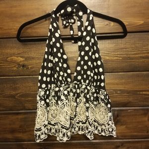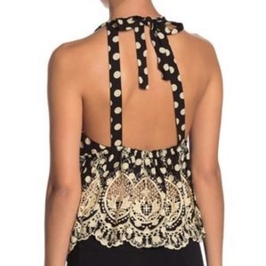 Embroidery and polka dots combine for a stylish look on this Lunch Date halter top. Halter neck with back tie closure - Sleeveless - Strappy back - Embroidered details - Polka dot pattern - Scalloped hem