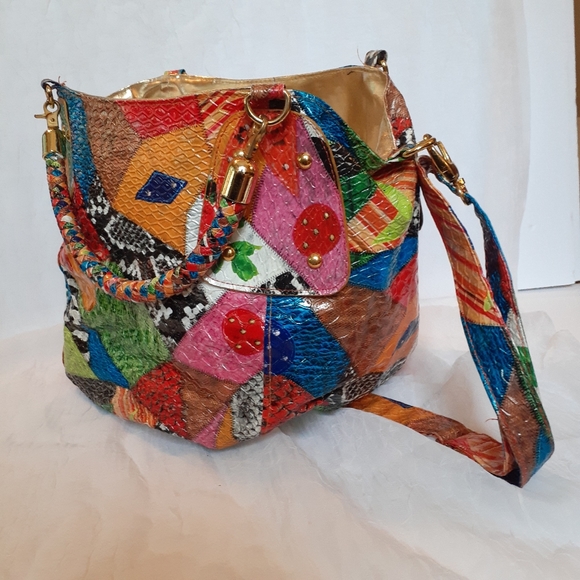 Bright colorful bucket bag. 1 zipper pocket and lots of room. Gold lining and can also be a crossbody. Super roomy and eye catching!
