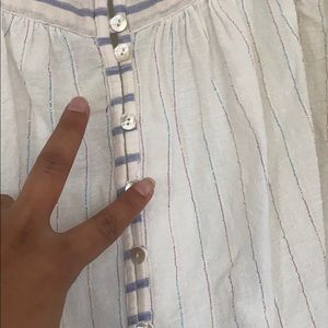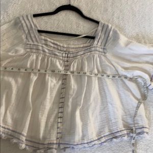 Free people small size really nice top with nice details crochet on the sleeves and shiny thread all over but the only thing I has some small yellow stains they’re really small the you can see Theo if you’re really close I don’t know how to treat or remove stains see pictures. This top retail for good price but ( I’m taking offers on it)