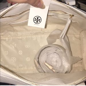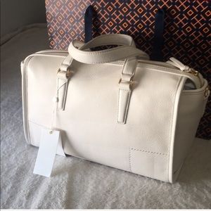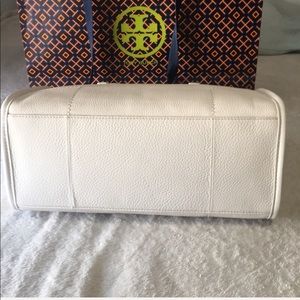 Defined by a clean, versatile shape punctuated with a cut-out double-T logo, our Britten Satchel is made of soft pebbled leather, with top handles and an optional, adjustable cross-body strap. The design is detailed with a secure zip closure and a roomy interior with multiple pockets. Holds a large wallet, a phone, a cosmetic case Adjustable, removable cross-body strap with 23.51" drop interior zipper pocket, 2 open pockets at back wall