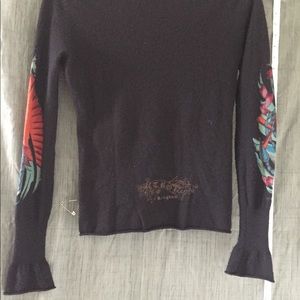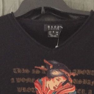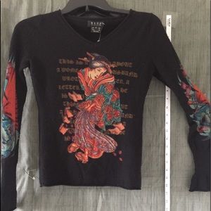 Detail on sleeves reminiscent of small tattoo wings matching front graphic. Note: Cuffs are slightly belled adds special high-end touch. Runs small - 0 or 2.