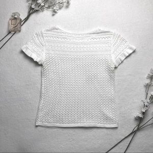 Excellent condition vintage crochet knit top, slightly cropped with ruffle details and ruffle sleeves. Perfect to pair with black high rise shorts and heels and your favourite corset or bralette underneath or wear casually with wide leg jeans. Similar to the sweater featured in the new Chloe Spring 2021 collection (first photo.)