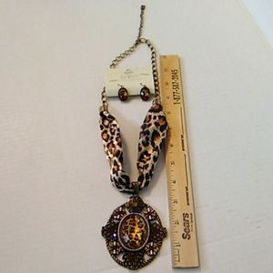 This Necklace is new still on the tags it came on. The leopard skin attached to the chain is cloth . The Earrings are about the size of a dime. Condition is new. Lead and Nickel safe.
